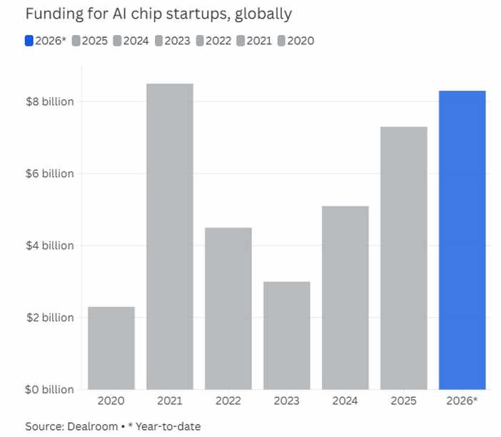 2026. gadā AI mikroshēmu jaunizveidotie uzņēmumi visā pasaulē ir palielinājuši 8,3 miljardus ASV dolāru, ziņoja CNBC, atsaucoties uz Dealroom datiem. Paredzams, ka šis skaitlis vēl vairāk pieaugs, ja finansējuma temps saglabāsies. Investori vairs neuzskata AI mikroshēmas par nišas kategoriju. Viņi tos atbalsta kā nākamā skaitļošanas viļņa galveno daļu.