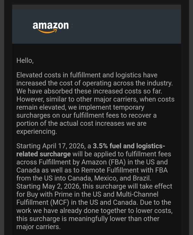 Amazon pārdevēji pamodās no jaunas izmaksu pozīcijas tikai dažas nedēļas pirms maksimālā vasaras pieprasījuma. Ziņojumā, kas nosūtīts caur Pārdevēju centrāli, Amazon paziņoja, ka no 2026. gada 17. aprīļa izpildes maksām sāks pievienot 3,5 % degvielas un loģistikas piemaksu. Šis solis tiek veikts laikā, kad degvielas cenas aug un globālie kuģniecības maršruti ir pakļauti spiedienam ASV un Irānas kara laikā.