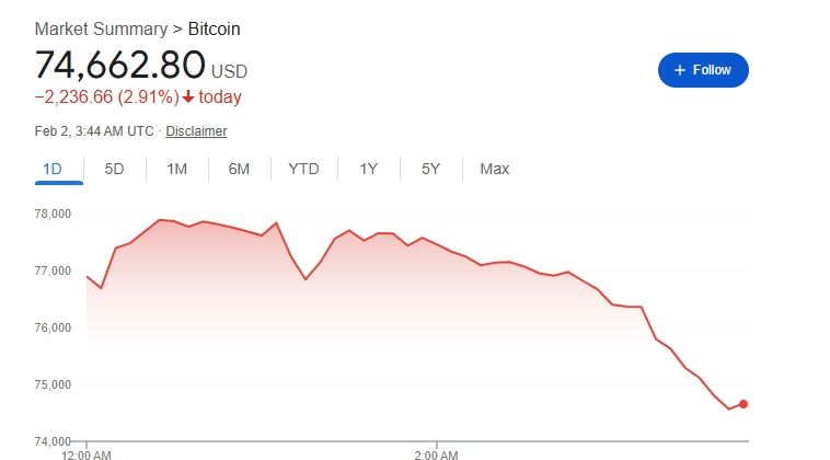 Bitcoin ir nedaudz atguvis un tagad tirgojas par USD 75 102,67 rakstīšanas brīdī.