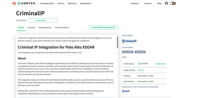 Criminal IP pakotnes ekrānuzņēmums vietnē Cortex Marketplace