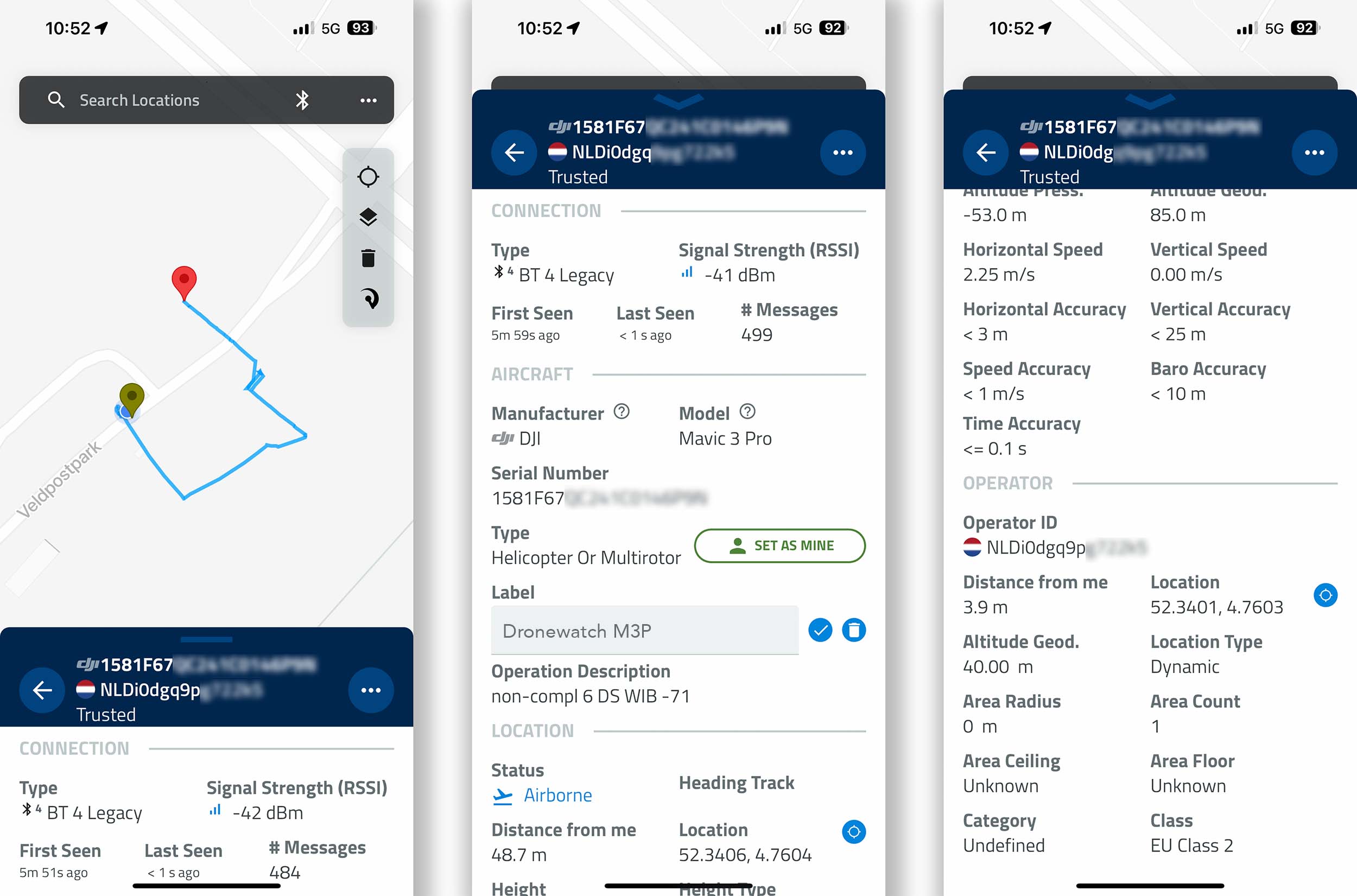 Izmantojot DroneScout Bridge, mans DJI Mavic 3 Pro, kas iepriekš nebija redzams mana iPhone 14 lietotnē Drone Scanner, kļuva uzreiz nosakāms. Lietotnē tika parādīta detalizēta informācija, tostarp drona augstums, atrašanās vieta, marka, modelis, sērijas numurs, operatora pozīcija un operatora ID (reģistrācijas numurs). Tas arī kartēja drona lidojuma trajektoriju. Pārbaudes laikā Remote ID signāli tika droši uztverti pat vairāku simtu metru attālumā.