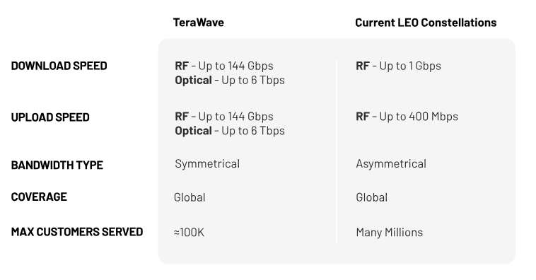 TeraWave ir paredzēts uzņēmumiem, datu centru operatoriem un valdības klientiem. Blue Origin saka, ka sistēma nodrošinās datu pārraides ātrumu “līdz 6 terabitiem sekundē”, izmantojot satelītus, kas izvietoti zemā Zemes orbītā un vidējā Zemes orbītā. Tas novieto tos no aptuveni 100 jūdzēm līdz 21 000 jūdzēm virs planētas, un tas ir diapazons, kas paredzēts, lai līdzsvarotu ātrumu, pārklājumu un uzticamību. Uzņēmums plāno sākt konstelācijas palaišanu 2027. gada ceturtajā ceturksnī.