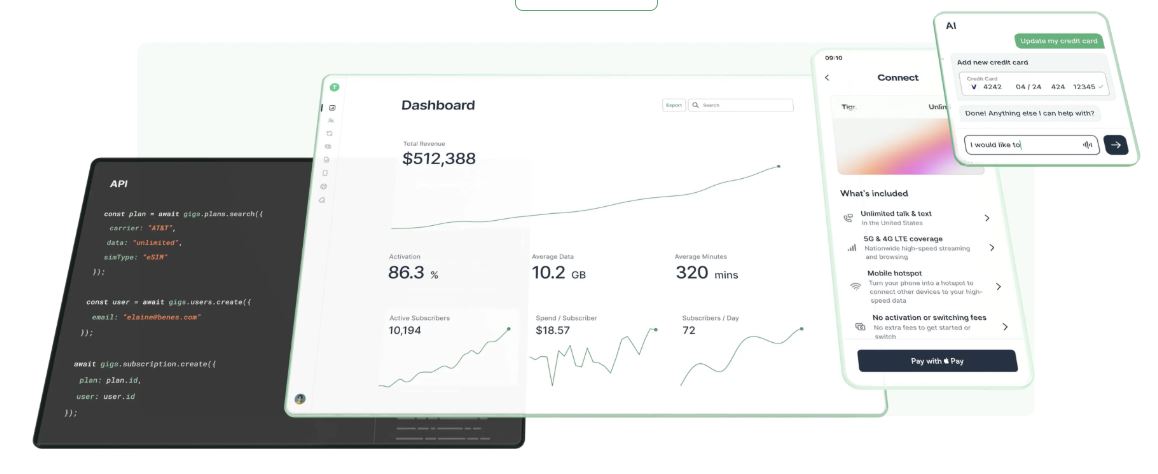 Gigs viss vienā risinājumā ietilpst vairumtirdzniecības savienojamība, intuitīvs API, mitināta norēķināšanās, vairāku valūtu maksājumu iespējas, nodokļu dzinējs, analītikas rīki, abonementu pārvaldība un AI vadīts klientu atbalsts. Ievērojami samazinot ekspluatācijas izmaksas un saīsinot laiku līdz tirgum, Gigs ļauj tehnoloģiju zīmoliem viegli integrēt mobilos pakalpojumus tieši savos produktos, piedāvājot lietotājiem nevainojamu pieredzi.