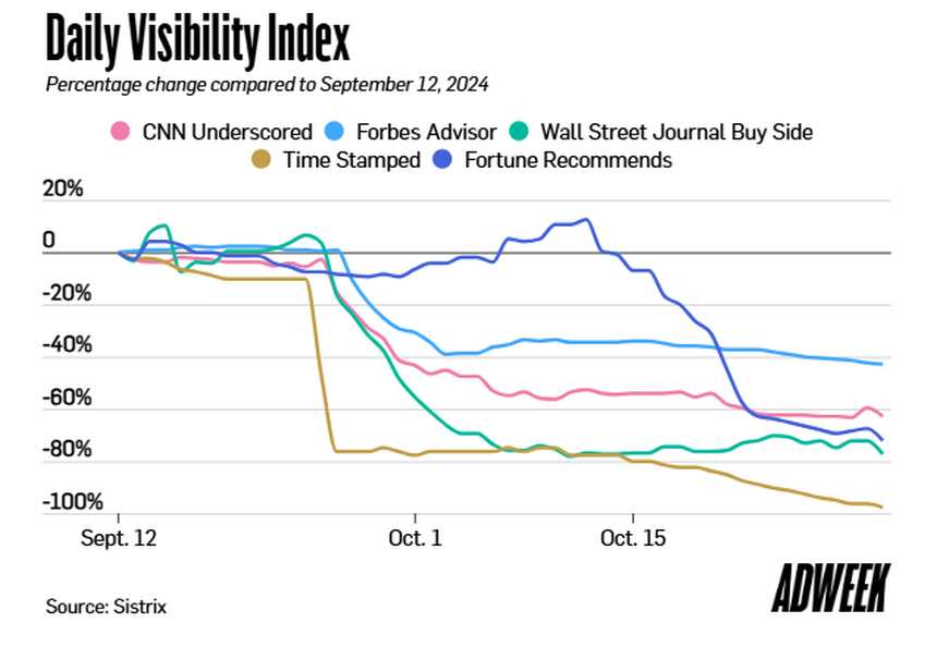 Kopš septembra šajās vietnēs ir novēroti meklēšanas redzamības zudumi, kuru vērtība ir novērtēta 7,5 miljoni ASV dolāru kumulatīvā satiksmes vērtībā. Meklēšanas redzamības samazināšanās sākās jūlijā, Time saistītajā biznesā, Laika zīmogspiedzīvojot strauju reitingu kritumu, norāda meklēšanas konsultants Glens Geibs. Septembra beigās un oktobrī līdzīgi kritumi skāra arī citu izdevēju saistīto platformu, kā ziņoja Sistrix, Gabe un divi papildu meklēšanas konsultanti.