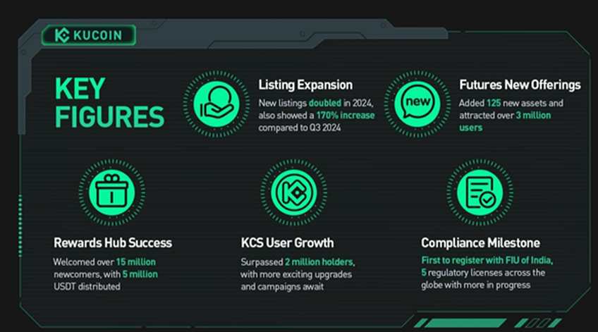 Kucoin globālā klātbūtne pieauga 2024. gadā, pārsniedzot 38 miljonus lietotāju. Izaugsme bija īpaši spēcīga Latīņamerikā un Tuvo Austrumu/Ziemeļāfrikas (MENA) reģionos. Vietas tirdzniecības apjomi MENA trīskāršojās, un Eiropā pieauga par 144%. Platforma divkāršoja savus jaunos ierakstus, sasniedzot rekordlielu pieaugumu par 170% Q4. Arī Kucoin nākotnes līgumu tirgus paplašinājās, pievienojot 125 jaunus aktīvus un piesaistot vairāk nekā 3 miljonus jaunu tirgotāju.