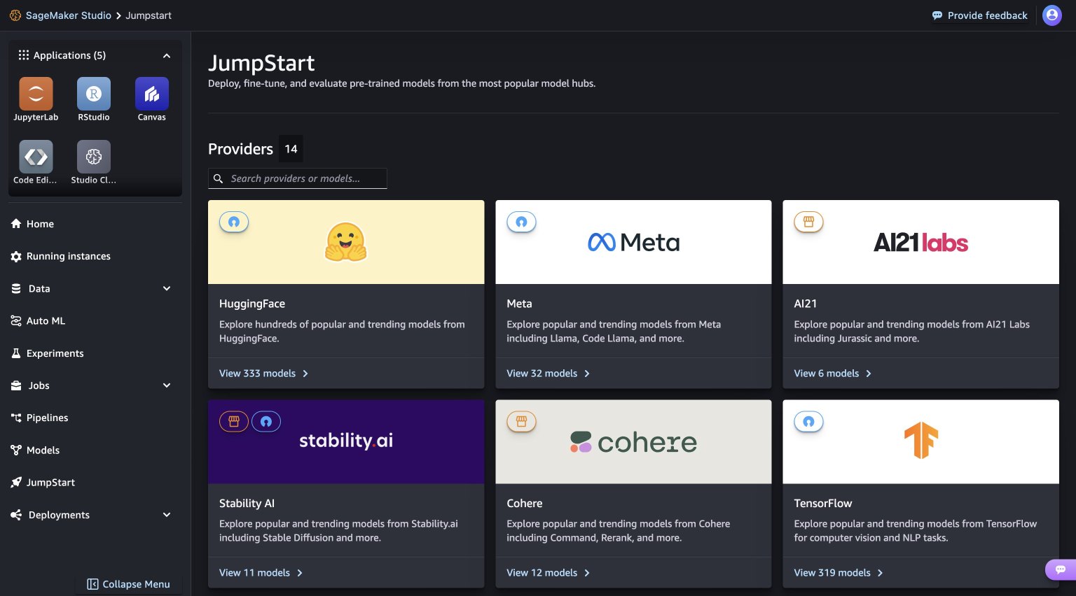 Kad atrodaties SageMaker JumpStart lapā, ir diezgan vienkārši atrast dažādus modeļus. Vienkārši pārlūkojiet centrus, kas būtībā ir sadaļas, kas nosauktas to cilvēku vārdā, kuri nodrošina modeļus. Piemēram, ja meklējat Llama 3 modeļus, dodieties uz Meta centru. Un, ja jūs tos nepamanāt uzreiz, neuztraucieties — vienkārši mēģiniet atjaunināt savu SageMaker Studio versiju, izslēdzot to un restartējot. Tam vajadzētu darīt to triku!