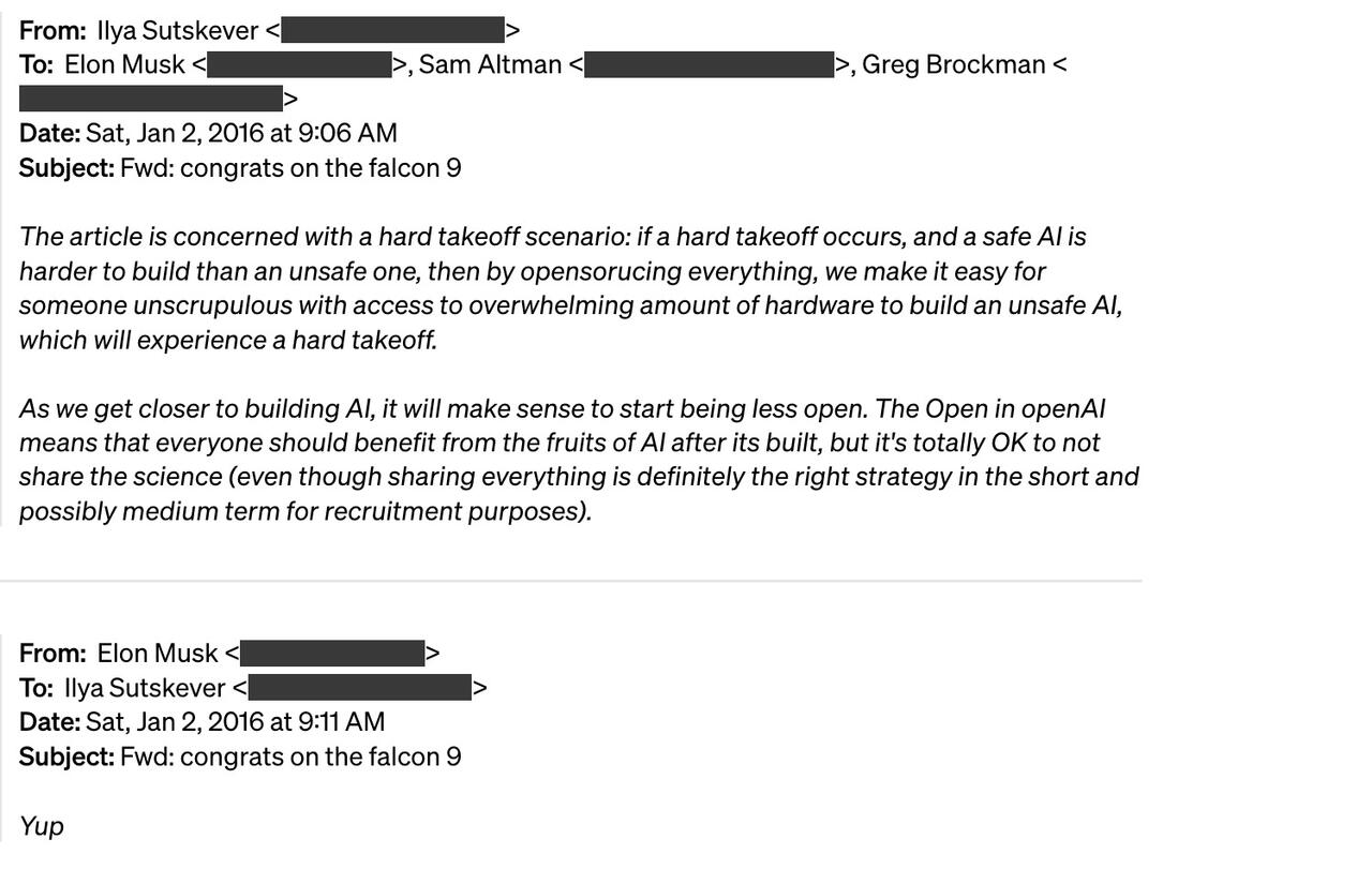 ChatGPT veidotājs arī nodrošināja e-pasta apmaiņu starp Sutskever un Musk, kur Sutskever minēja: “Tuvojoties AI veidošanai, būs jēga sākt būt mazāk atvērtam. OpenAI OpenAI nozīmē, ka ikvienam vajadzētu gūt labumu no AI augļiem pēc tā izveides, taču ir pilnīgi pareizi nedalīties ar zinātni…”, uz ko Īlons atbildēja ar vienkāršu “Jā”.