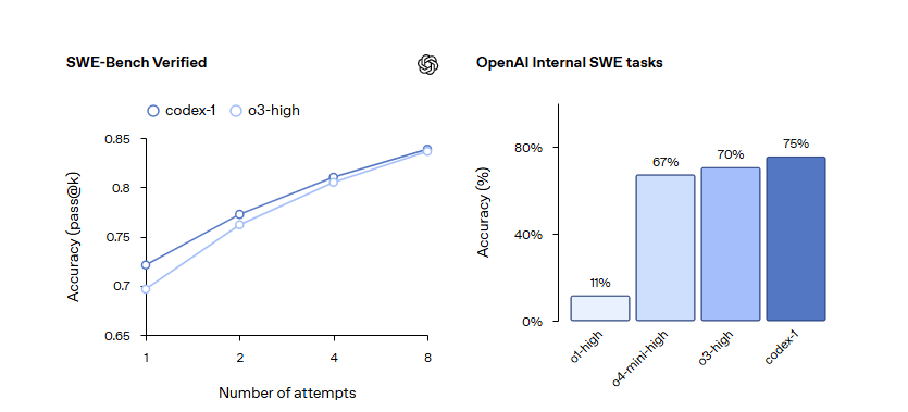 Codex parāda iespaidīgu veiktspēju gan iekšējos, gan ārējos etalonos. Openai kurinātajā reālās pasaules SWE uzdevumu komplektā Codex-1 sasniedz caurlaides@1 precizitāte pat 80%— Nenozīmīgi pārspēt iepriekšējos modeļus, piemēram, O1 un O4-Mini. Pat bez aģentiem.md konfigurācija CodeX joprojām darbojas droši.