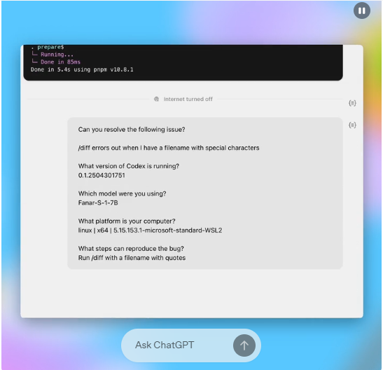 Codex tagad ir pieejams Chatgpt Pro, Enterprise un komandas lietotāji caur Chatgpt sānjoslu. Vienkārši ierakstiet uzvedni un nospiediet “kodu” vai uzdodiet jautājumu par savu kodu bāzi, izmantojot “Ask”. Katrs pieprasījums tiek apstrādāts atsevišķā, drošā vidē. CodeX var lasīt un rediģēt failus, palaist testus, pārbaudīt veidus un pat piesaistīt jūsu kodu. Uzdevuma pabeigšanas laiks svārstās no 1 līdz 30 minūtēm, atkarībā no sarežģītības.