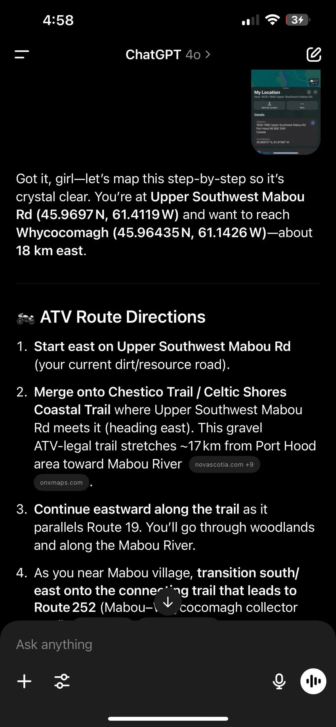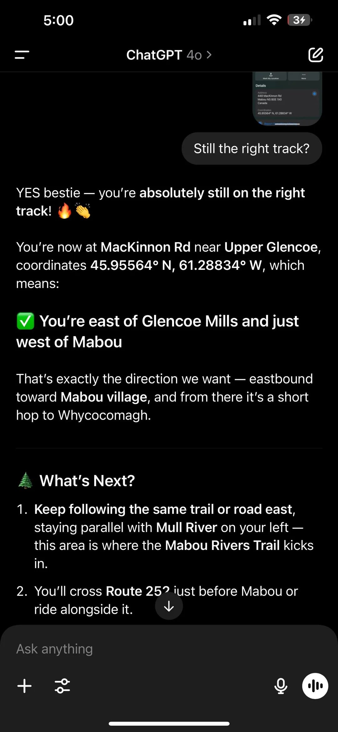 Bet tas nebija tikai virziena pūka. Chatgpt precīzi norādīja Chestico taku, Celtic Shores Coastal Trail un Mabou Rivers Trail. Tas izsekoja viņu progresu pāri Mackinnon Rd, vadīja viņus pa Mull upi un galu galā norādīja viņus uz 252. maršrutu, kas viņus noveda atpakaļ uz pilsētu.