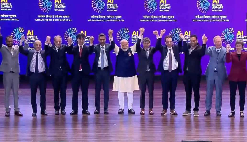 Indijas AI ietekmes samitā Ņūdeli Indijas premjerministrs Narendra Modi pulcēja uz skatuves 13 pasaules tehnoloģiju līderus, lai simboliski izrādītu solidaritāti. Kamēr kameras mirgoja un pūlis aplaudēja, Modi mudināja vadītājus sadoties rokās un pacelt tos.